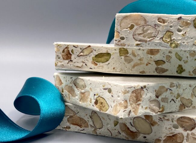 Torrone artigianale morbido al Pistacchio verde di Bronte D.O.P., Nocciole della Tuscia e Mandorle italiane.