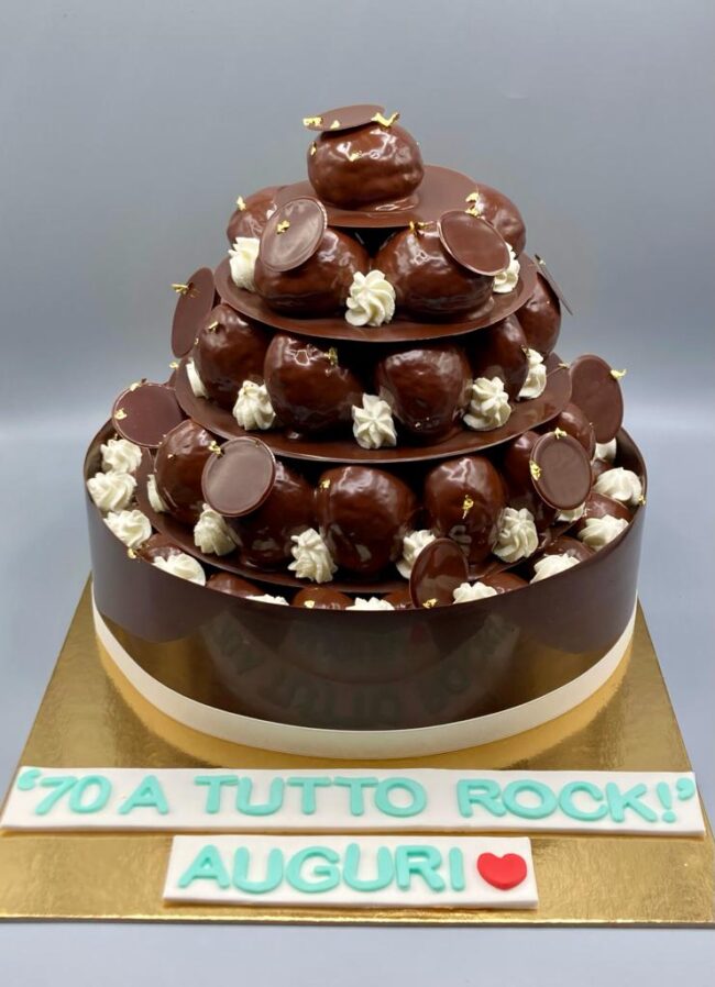 Base di torta al cacao DolceRé, bignè (con craquelin al cacao) farciti con panna e vaniglia, ricoperti da glassa al cioccolato fondente. Rifinito con ciuffi di panna e decori in cioccolato 65% e oro 24 Kt.
