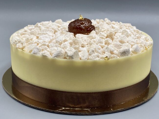 Base DolceRé al cacao, crema di marroni, marroni selezionati canditi, crema leggera alla panna e vaniglia Madagascar, girotorta in cioccolato 35%, rifinita con meringa ad alta frammentazione, marroncino candito e oro alimentare 24 Kt.